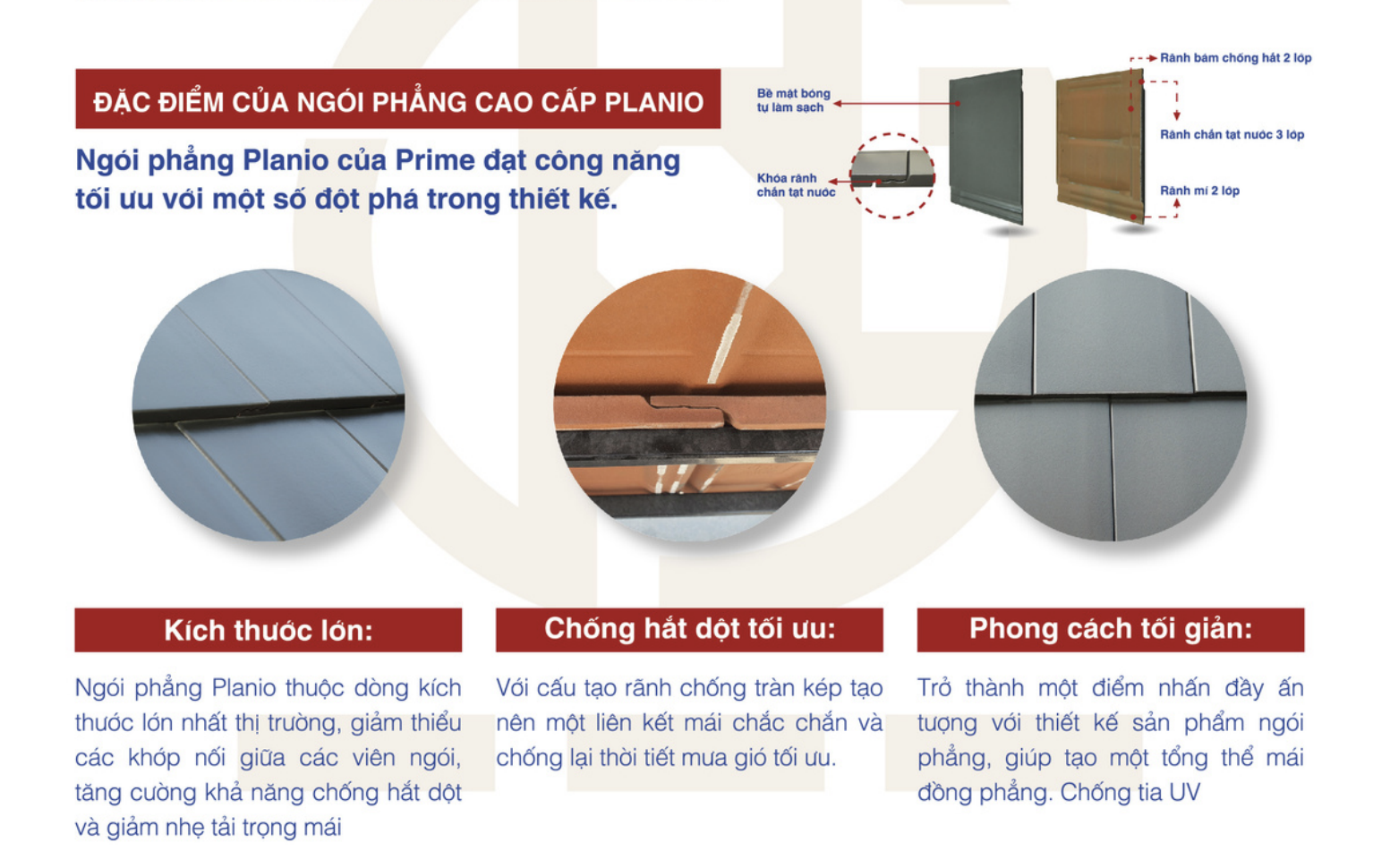 Chống hắt, dột tối ưu: Với cấu trúc rãnh chống tràn kép và lớp tráng men cao cấp, Planio tạo liên kết mái chắc chắn, chống thời tiết mưa gió tối ưu.
