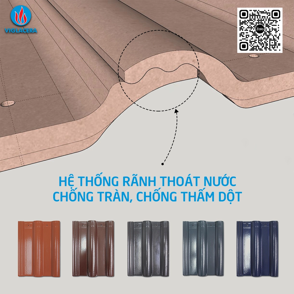 - Ngói Viglacera tráng men được thiết kế với các sóng âm dương và hệ thống rãnh thoát nước khoa học ở cả mặt trước và mặt sau của viên ngói. Điều này giúp ngói thoát nước nhanh chóng và hiệu quả, ngay cả trong điều kiện mưa to kéo dài. Mái ngói được tráng men giúp nước mưa dễ dàng trôi đi, ngăn ngừa tình trạng đọng vũng và rêu mốc.