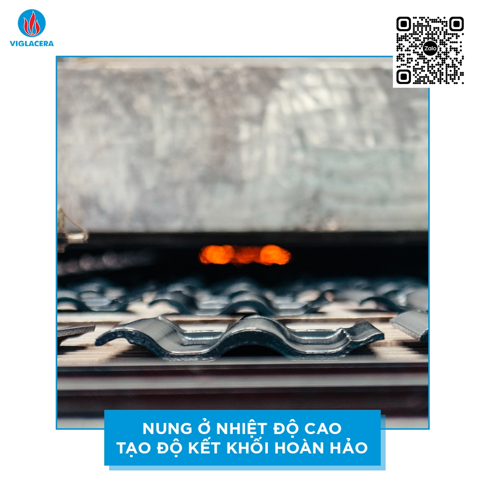 - Ngói Viglacera tráng men phải trải qua một chu kỳ nung dài ở nhiệt độ từ 1.100 đến 1.185 độ C, giúp tạo ra sự kết khối hoàn hảo giữa xương ngói và lớp men. Điều này không chỉ đảm bảo màu sắc ngói không bị phai mờ theo thời gian mà còn giữ được vẻ đẹp thẩm mỹ bền vững trước những tác động của thời tiết và môi trường.