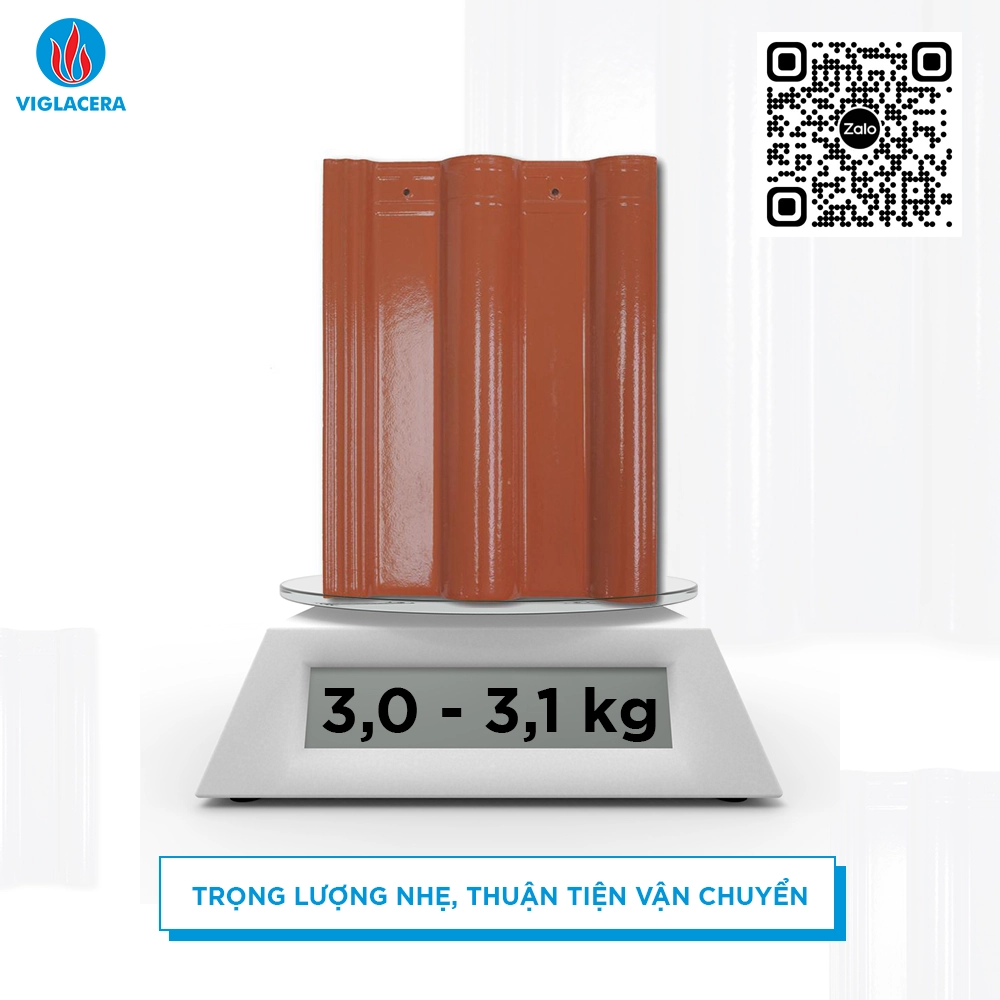 - Một viên ngói Viglacera tráng men có trọng lượng chỉ từ 3,0 đến 3,1 kg, nhẹ hơn nhiều so với ngói đất nung (4,0 – 4,2 kg). Trọng lượng nhẹ giúp giảm tải trọng lên hệ thống mái, cho phép sử dụng các kết cấu mái nhẹ hơn mà vẫn đảm bảo an toàn và bền vững. Điều này không chỉ tiết kiệm chi phí cho hệ thống cột, dầm và móng mà còn giảm thiểu công sức và thời gian thi công.